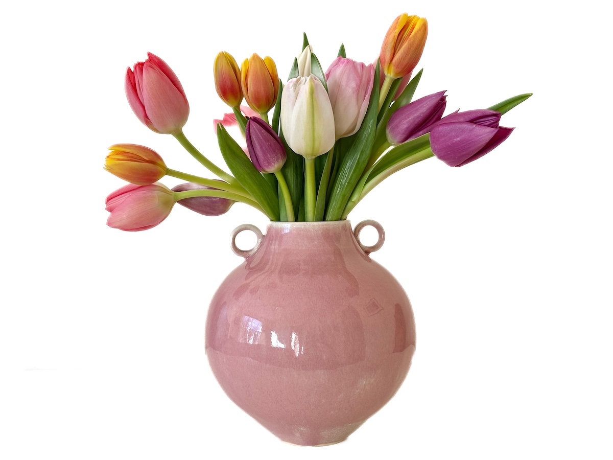 Handmade pink glazed ceramic vase with loop handles filled with colorful tulips by Lisette Bedoya, pottery instructor at A Maker's Circle in Pottersville NJ