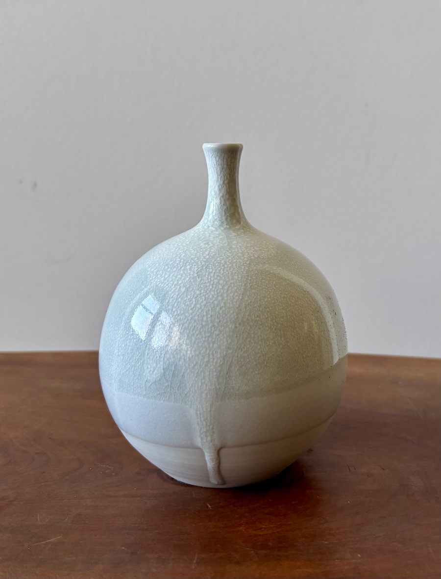 Handmade wheel-thrown ceramic bud vase with crackle white glaze by Lisette Bedoya, pottery instructor at A Maker's Circle in Pottersville NJ
